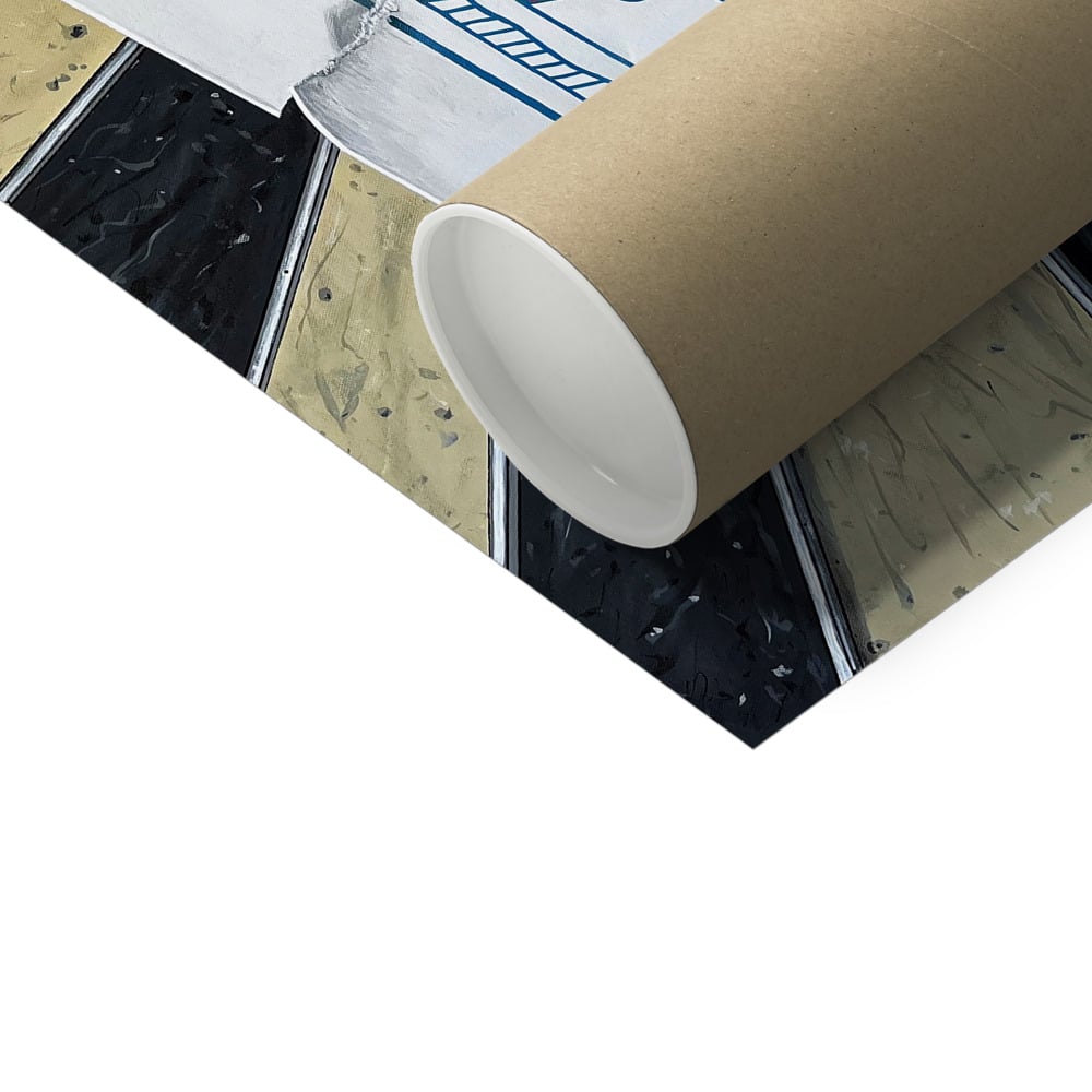 Prints larger than A4 are sent rolled in a cardboard tube. Unpack & flatten with care.
